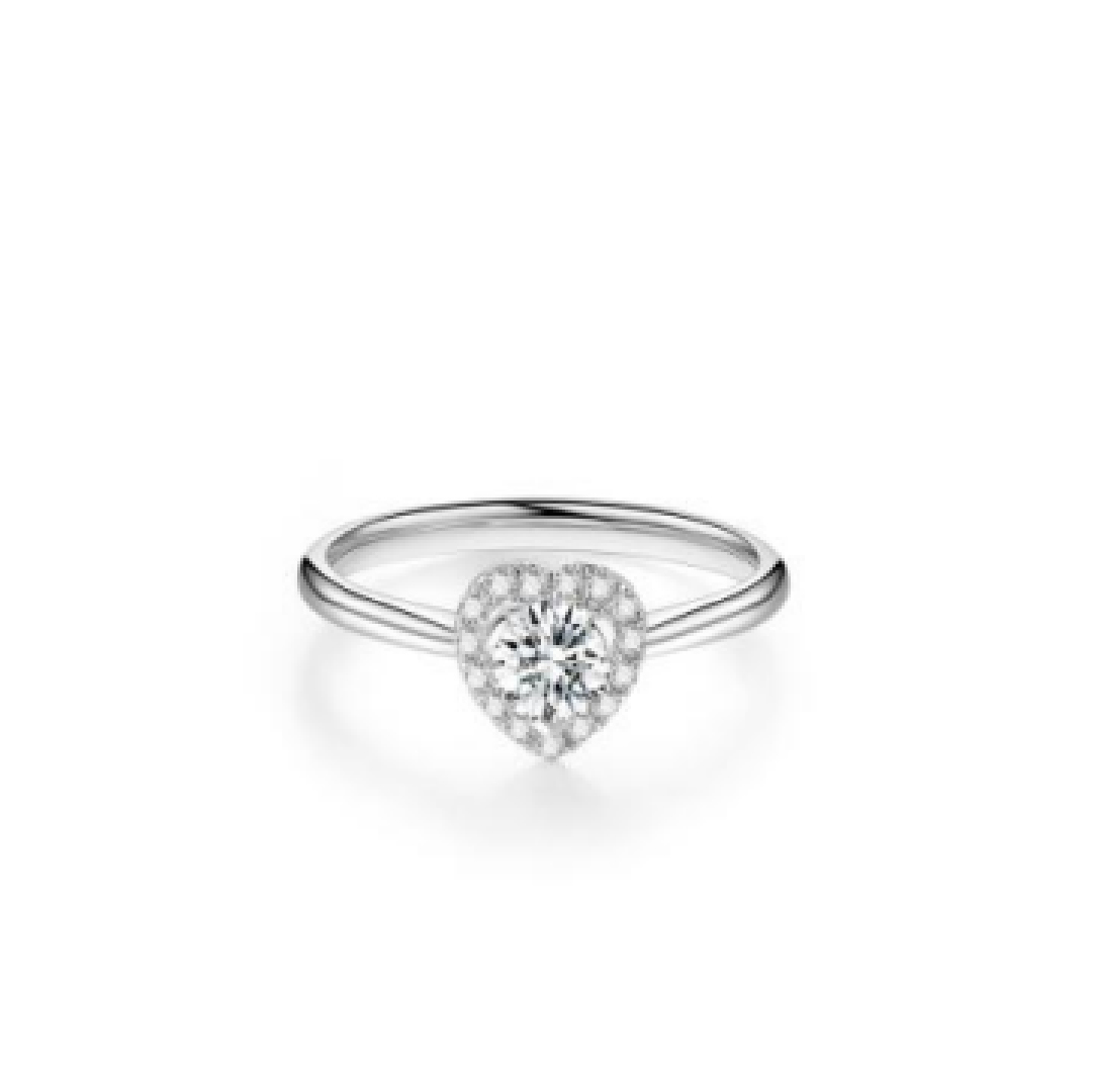 A lab-grown diamond in a romantic heart cut sits at the center, surrounded by a delicate halo that enhances its sparkle and shape. The slender band keeps the look timeless and elegant, while the halo detail adds brilliance with every glance.